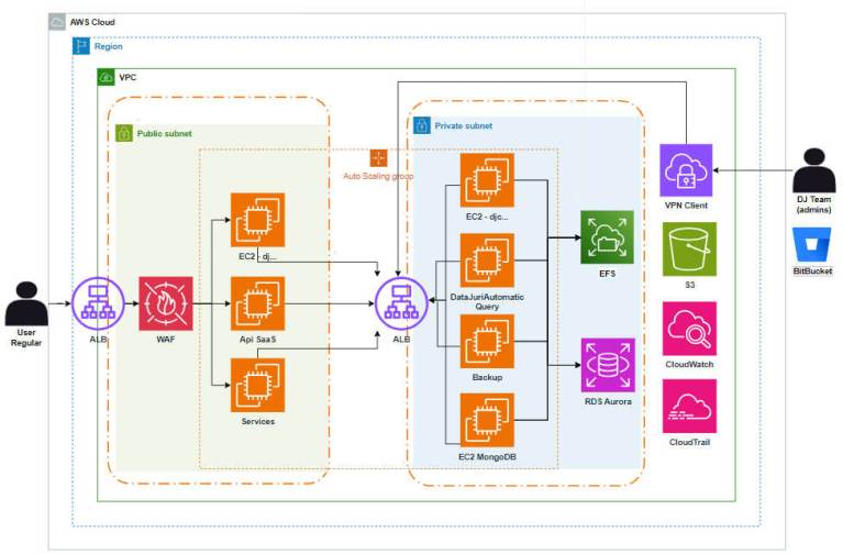 Para atender às necessidades da DataJuri, a Opsteam projetou e implementou uma arquitetura personalizada na AWS que abrangeu várias práticas de segurança, resiliência e escalabilidade.